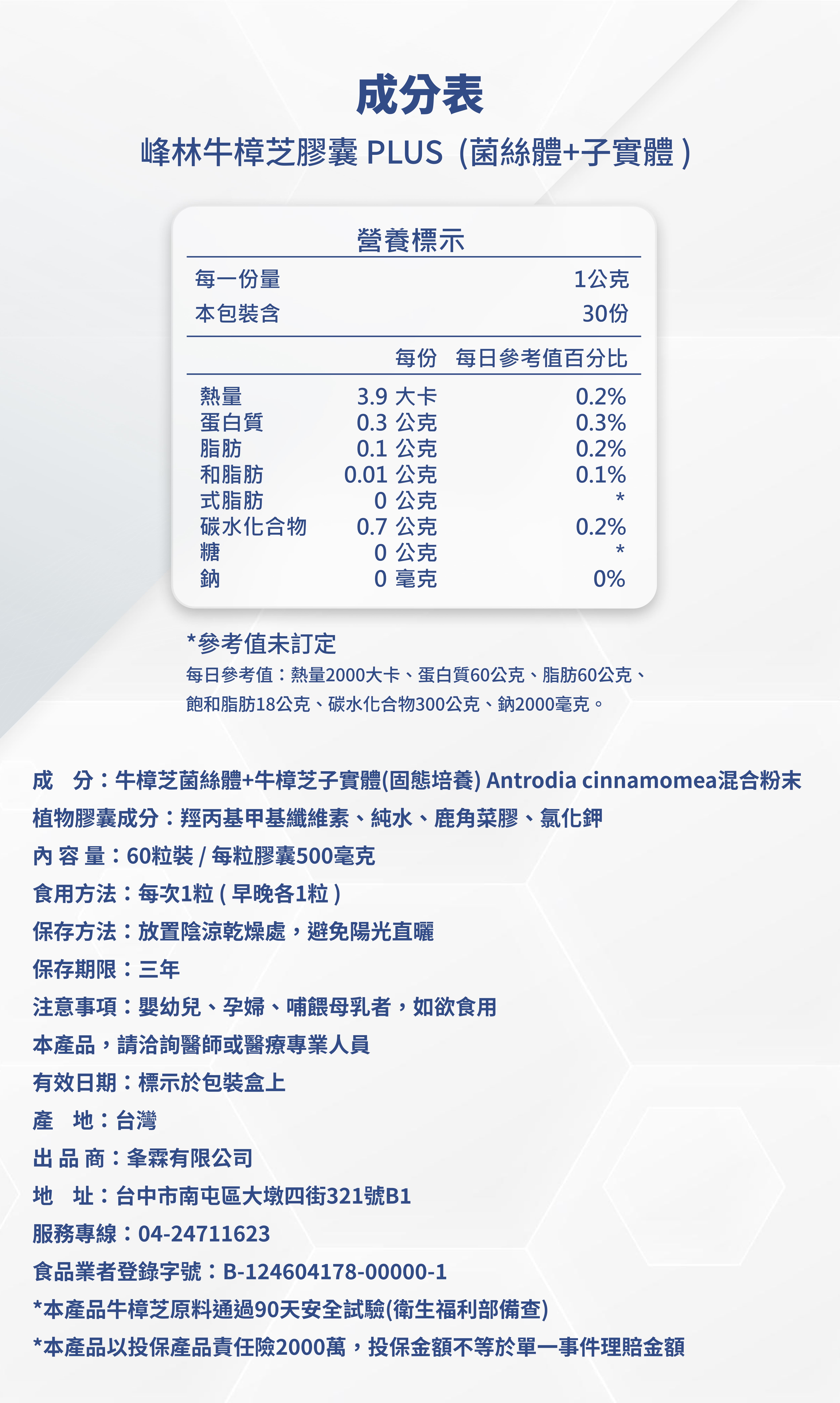 成分:牛樟芝菌絲體+牛樟芝子實體(固態培養)