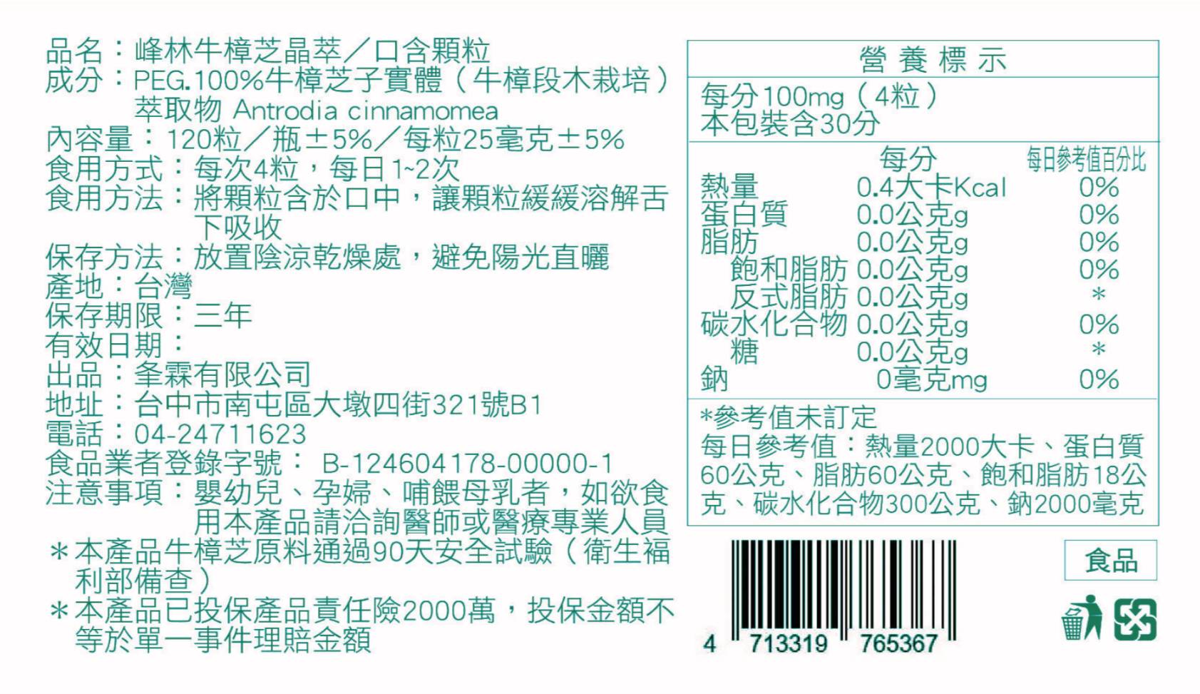 成分:PEG. 100%牛樟芝子實體 ( 牛樟段木栽培 )