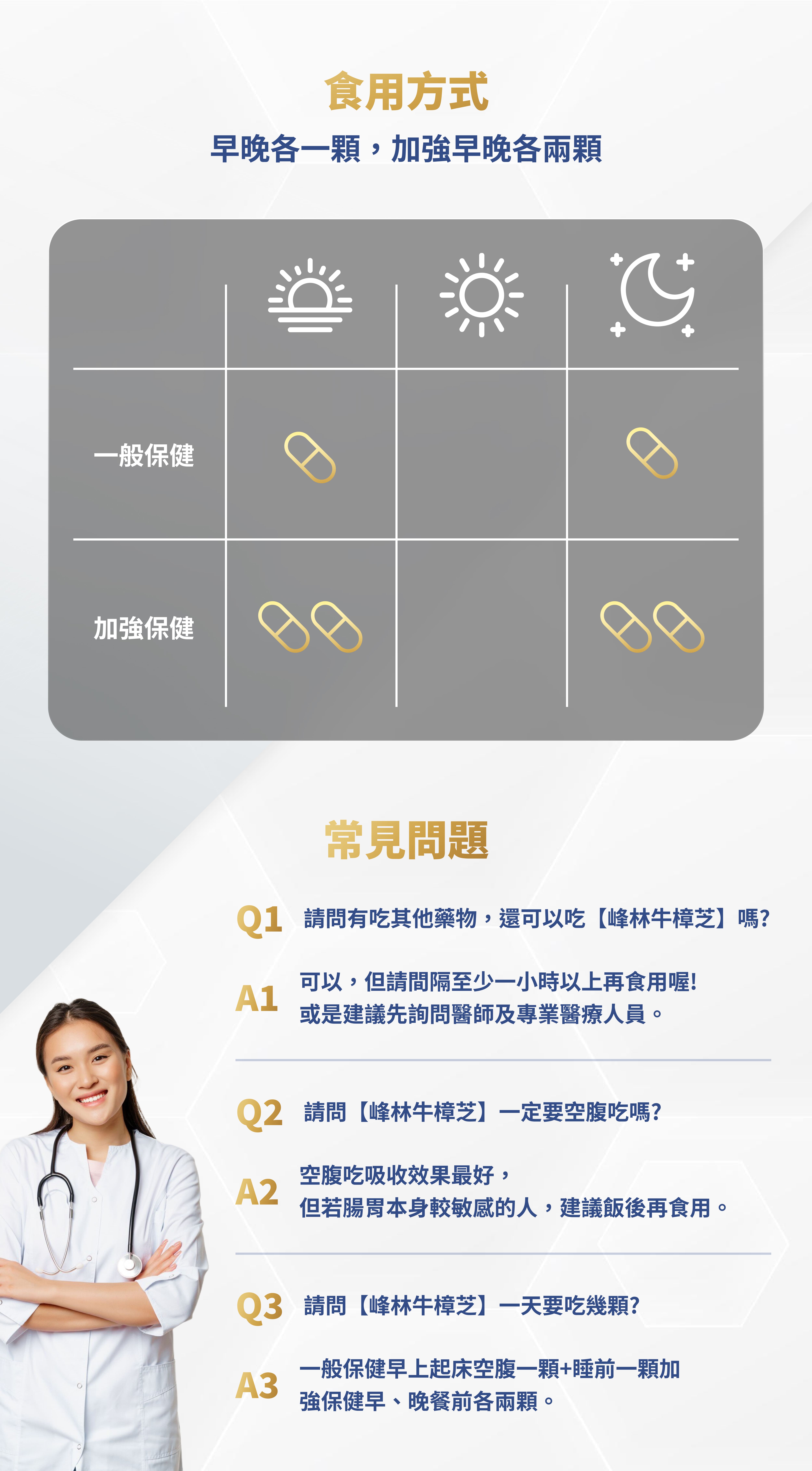 * 建議早上起床空腹 1 粒 + 晚上睡前 1 粒(加強各 2 粒),或是飯前半小時飯後1小時,食用效果佳。