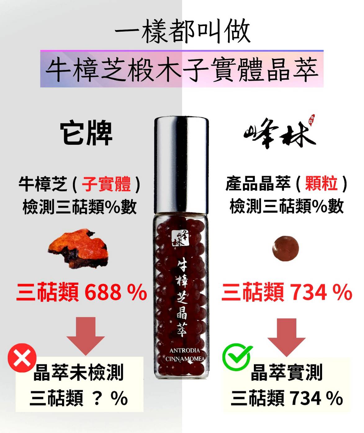 有些牛樟芝業者會使用 [ 牛樟芝子實體 ] 檢測三萜類%數,來當做自家產品的三萜類%數使用,但這明顯誤導消費者!因您是購買 [ 牛樟芝產品 ] 不是購買 [ 牛樟芝子實體 ] ,要真正吃到三萜類成份,要選購使用 [ 產品內容物 ] 檢測三萜類的牛樟芝產品喔!